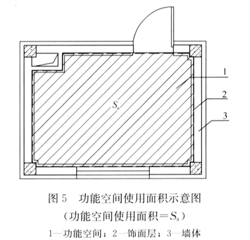 功能空间使用面积:即房间净面积,这里“墙体内表面”是指围合功能空间的墙体基层表面,不包含墙体饰面层(图5)。