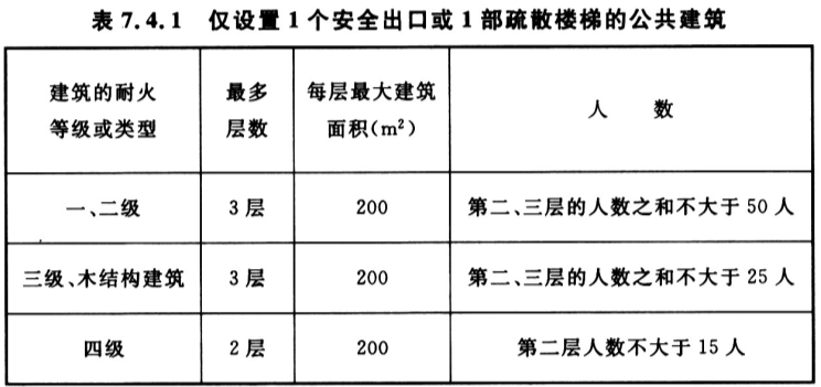 7. 4. 1 公共建筑内每个防火分区或一个防火分区的每个楼层的安全出口不应少于2个;仅设置1个安全出口或1部疏散楼梯的公共建筑应符合下列条件之一: