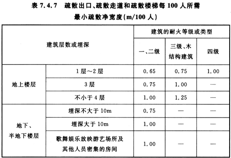 7. 4. 7 除剧场、电影院、礼堂、体育馆外的其他公共建筑,疏散出口、疏散走道和疏散楼梯各自的总净宽度,应根据疏散人数和每100人所需最小疏散净宽度计算确定,并应符合下列规定: