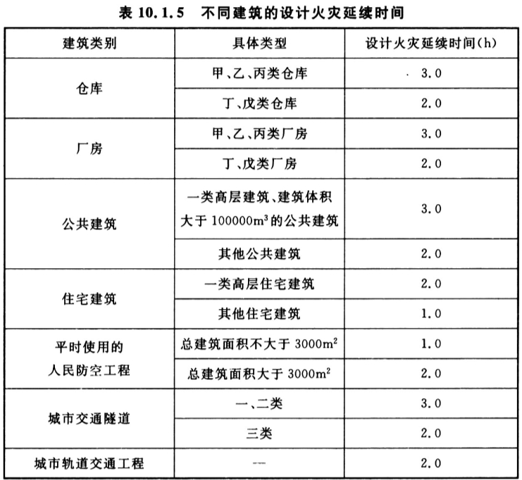 10. 1. 5 建筑内的消防用电设备应采用专用的供电回路,当其中的生产、生活用电被切断时,应仍能保证消防用电设备的用电需要。除三级消防用电负荷外,消防用电设备的备用消防电源的供电时间和容量,应能满足该建筑火灾延续时间内消防用电设备的持续用电要求。不同建筑的设计火灾延续时间不应小于表10.1.5的规定。