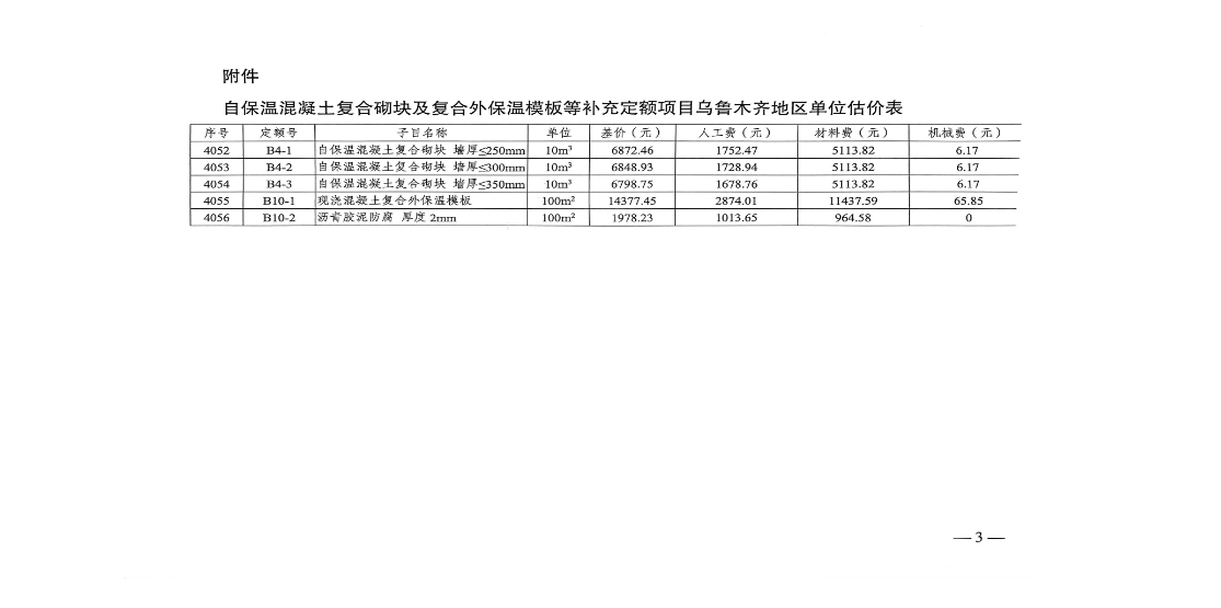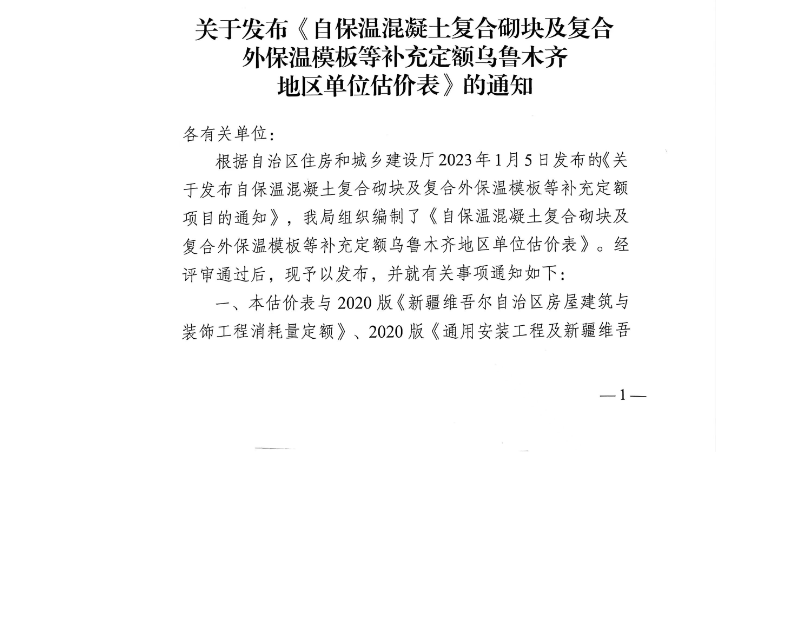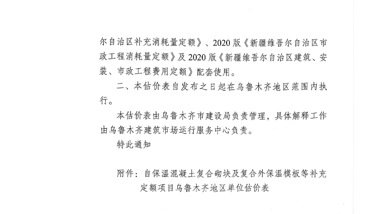 关于发布《自保温混凝土复合砌块及复合外保温模板等补充定额乌鲁木齐地区单位估价表》的通知
