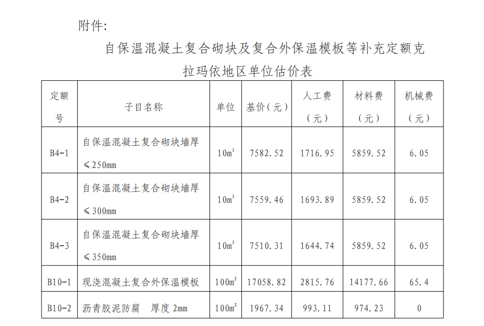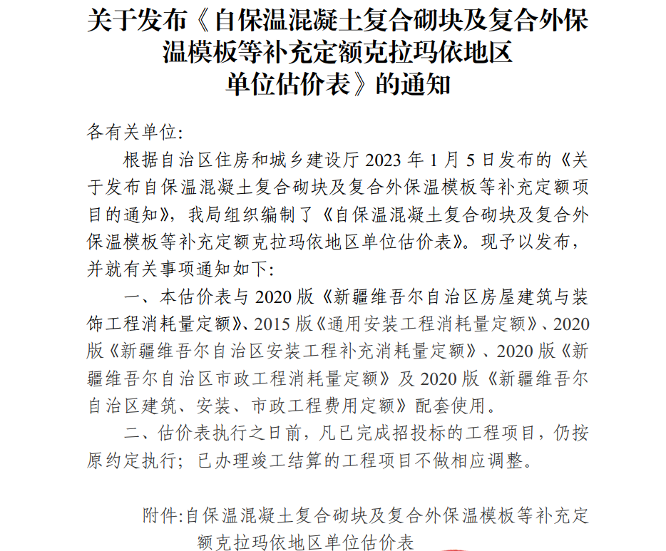 关于发布《自保温混凝土复合砌块及复合外保温模板等补充定额克拉玛依地区单位估价表》的通知