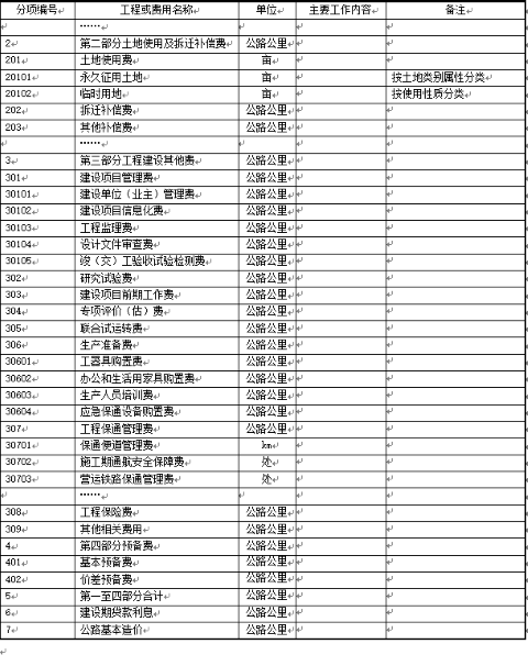分项编号 | 工程或费用名称 | 单位 | 主要工作内容 | 备注 |